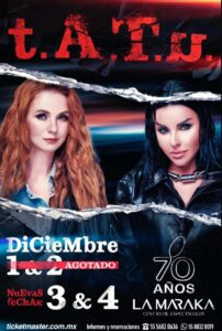 Hoy, con una trayectoria que incluye récords de ventas, giras mundiales y un legado pop indiscutible, t.A.T.u vuelve para demostrar que su impacto nunca se fue; simplemente estaba esperando el momento perfecto para renacer. Sus shows en La Maraka prometen un encuentro íntimo, energético y cargado de nostalgia, ideal para quienes crecieron con ellas… y para quienes están descubriendo su historia por primera vez.